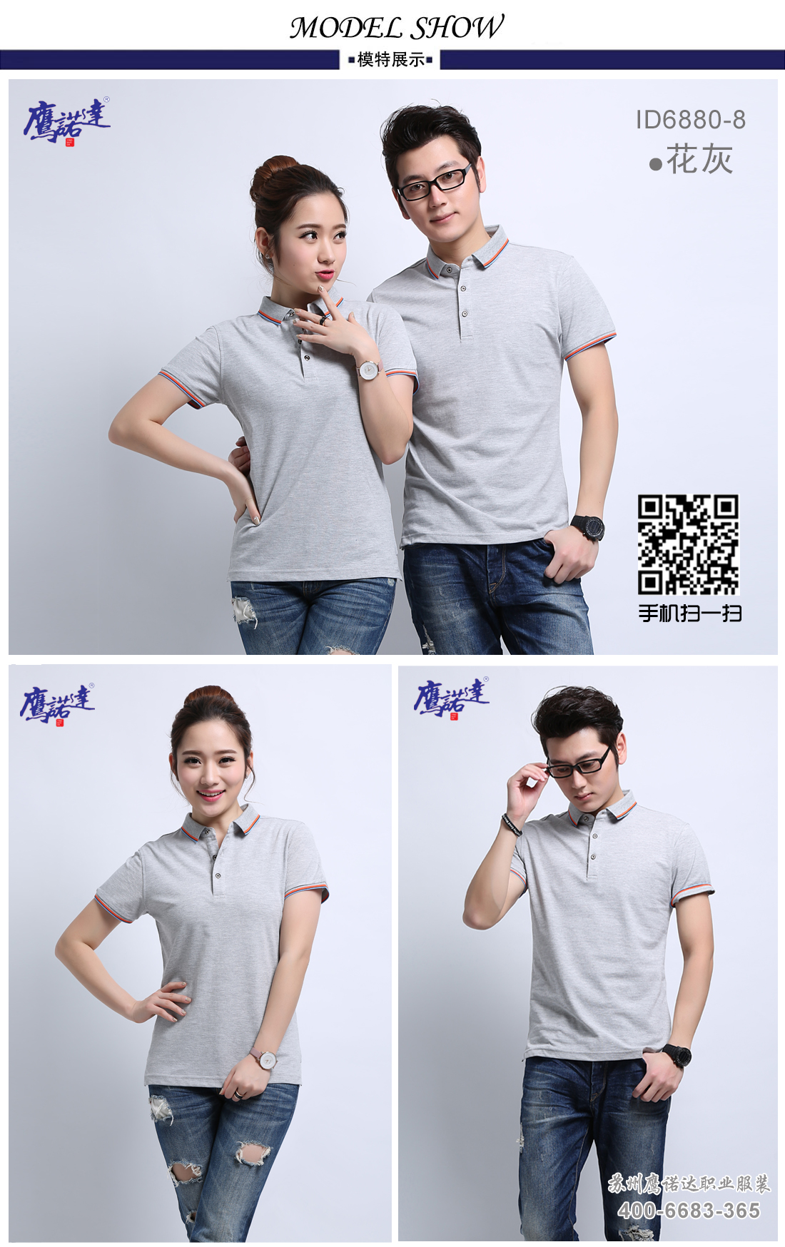 - 游客于 2018-04-16 09:44:07 发表苏州鹰诺服装:花灰超爽桑蚕棉t恤衫工作服ID6880-8
