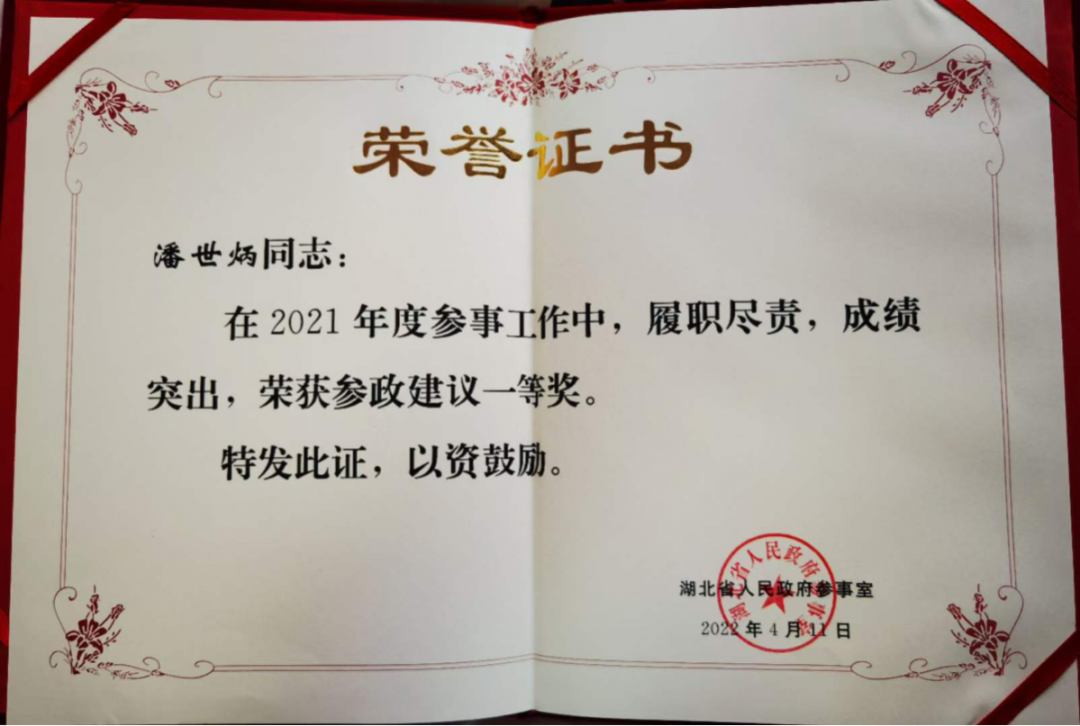 湖北省政府参事、永业行董事长潘世炳荣获参政建议一等奖
