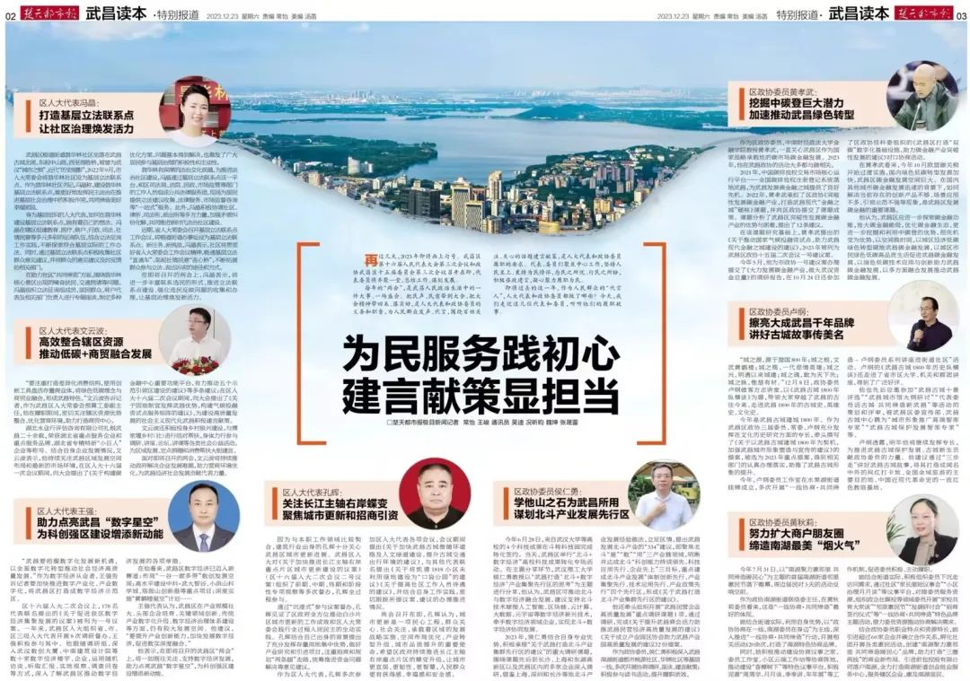 会上,来自武昌区各行各业、各条战线的人大代表汇聚一堂,为武昌区高质量发展建言献策。作为武昌区人大常委会预算工委副主任,文云波密切关注辖区资源优势整合、优化营商环境,助力打造商贸中心。他提出要高效整合辖区资源,推动低碳+商贸融合发展,“要注重打造差异化消费结构,使用创新工具盘活存量商业体,将绿色低碳理念与商贸业融合,形成武昌特色。”