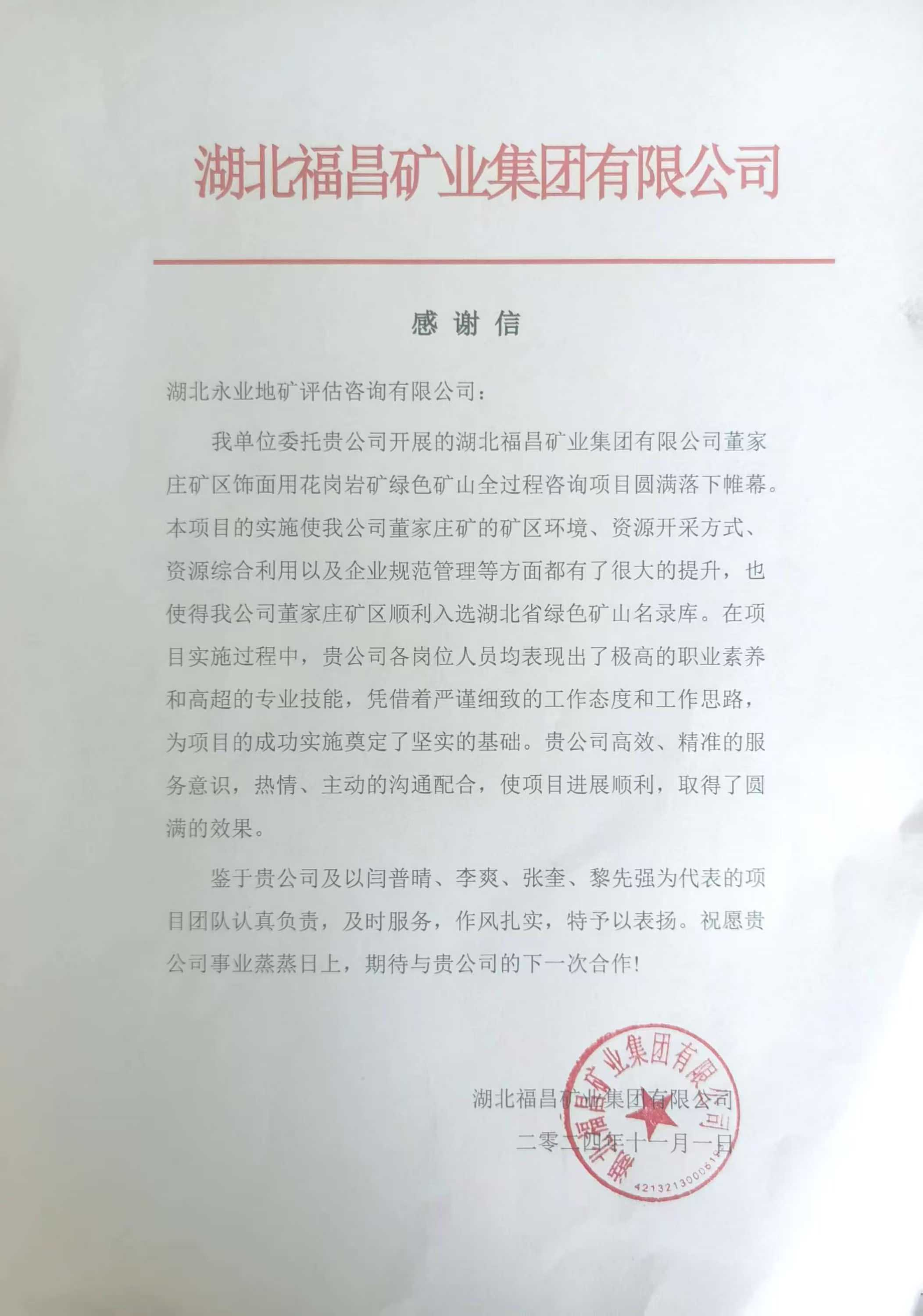 近日,永业行凭借卓越的专业服务和深厚的行业积淀,助力湖北福昌矿业集团有限公司(下称“福昌矿业”)董家庄矿区入选湖北省“省级绿色矿山”。2024年11月1日,福昌矿业致函永业行,对我司承担的绿色矿山全过程咨询服务给予肯定和感谢。